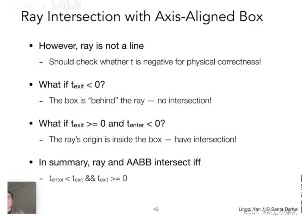 不难,老师的ppt已经讲得很清楚了。核心本质就是当光线进入盒子中时,必然点进入了所有的对面(对应max(tmin)),当光线离开盒子时,必然离开了某一个对面(对应min(tmax)),所以才会有max和min的处理。