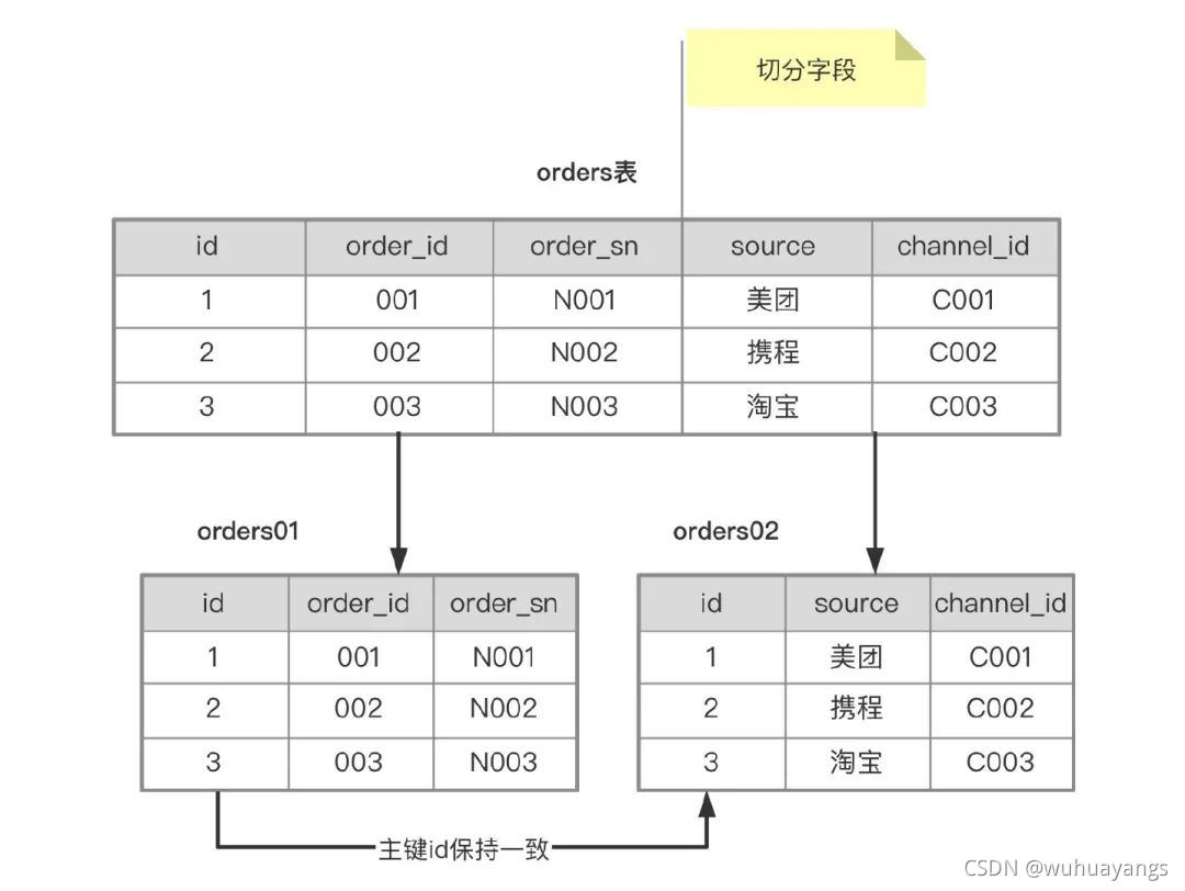 垂直切分:基于表或字段划分,表结构不同。我们有单库的分表,也有多库的分库。