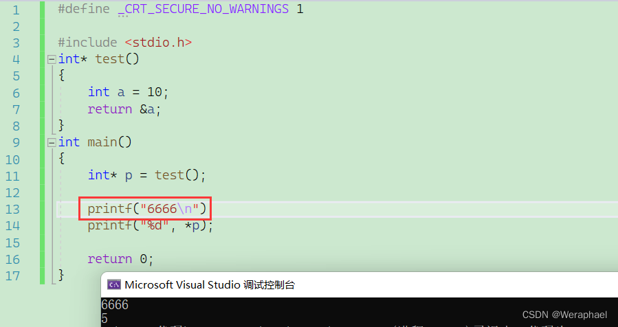 解析:首先a是一个局部变量,根据局部变量的生命周期,出了它的作用域,生命周期结束。返回的时候a的地址就已经被销毁了,此时的地址就是一个野指针。但是运行的时候结果还是10,这只是侥幸,这是因为之前的内存空间还没有被覆盖。我们加上个输出语句就能破坏掉这个内存空间。