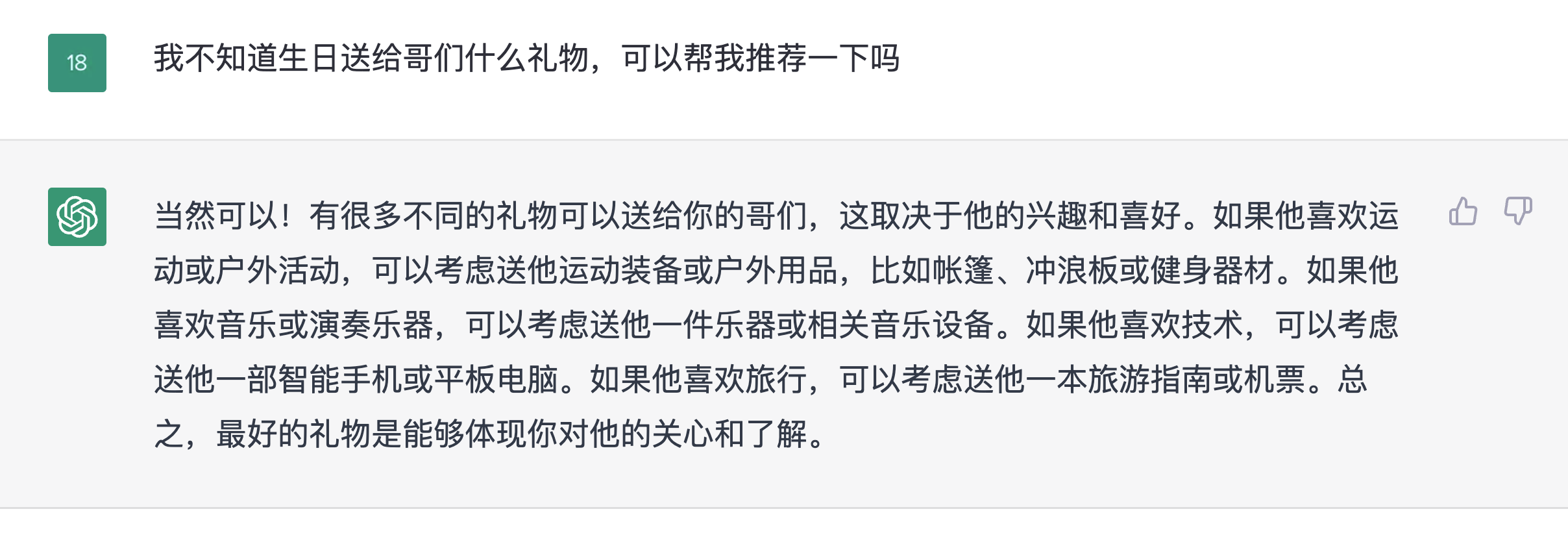 1. 问答提示 2. 解释复杂的概念 3. 创作 创作需要尽可能的缩小范围,提出具体的要求,AI会给出更好的答案。 4. 准备面试 5. 教师教案 6. 编码和集成 7. 健身 8. 送礼推荐 9. 翻译 这个甚至不用去演示,openAI的翻译能力非常强大,甚至大幅超越了DeepL。 10. 起名字