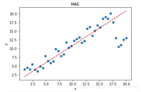 缺点:梯度是误差的2倍,对于离群点,误差极大梯度也大,模型对离群点敏感,受其影响较大,模型给离群点较大的权重,可能会往离群点方向偏移,导致牺牲正常点的预测效果,最终降低模型的整体性能。如下图