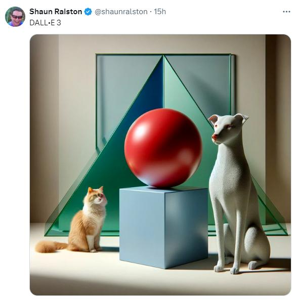 “蓝色立方体上有一个红色球体的照片。后面是一个绿色三角形,右边是一只狗,左边是一只猫”。(Prompt:Photo of a red sphere on top of a blue cube. Behind them is a green triangle, on the right is a dog, on the left is a cat)