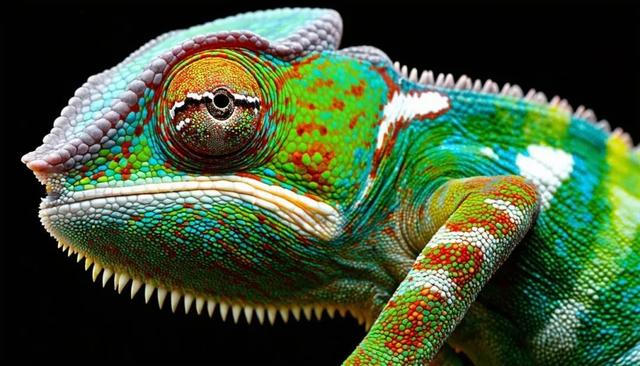 “黑色背景上变色龙的摄影棚照片特写。”(Prompt: studio photograph closeup of a chameleon over a black background)