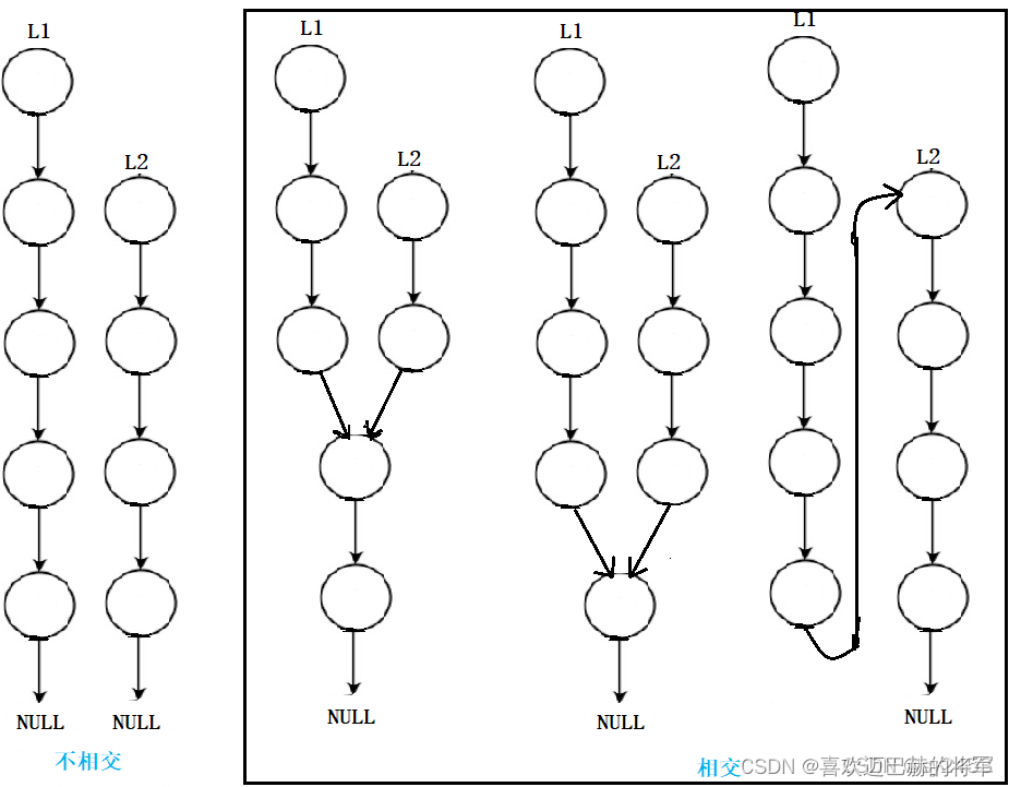 检测两个链表(不带环)是否相交:(1).找到两个链表的最后一个节点;(2).检测两个链表的最后一个节点是否相同。