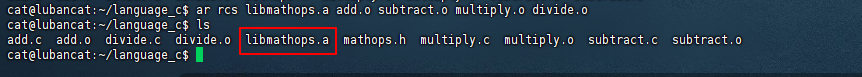 这个命令创建了一个名为libmathops.a的静态库文件,包含了之前编译的所有目标文件。