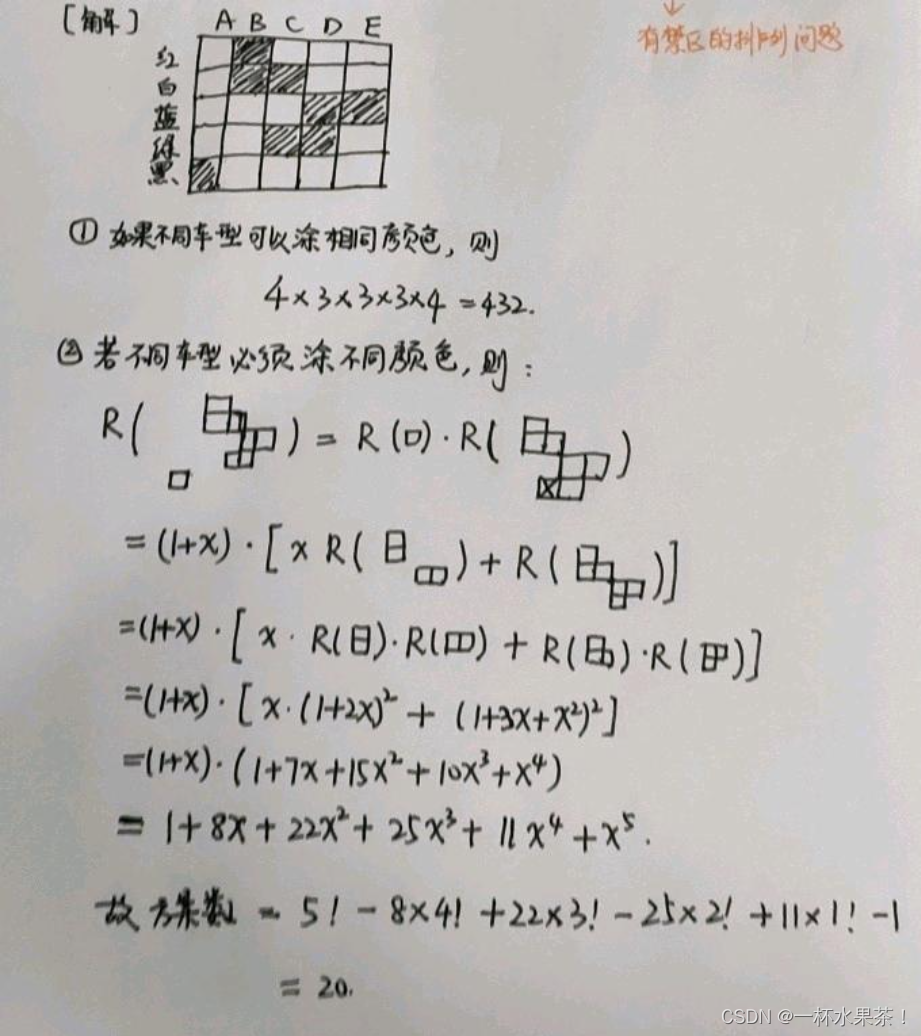 有 A , B , C , D , E A,B,C,D,E A,B,C,D,E 五种型号的轿车,用红、白、蓝、绿、黑五种颜色进行涂装。要求 A A A 型车不能涂成黑色; B B B 型车不能涂成红色和白色; C C C 型车不能涂成白色和绿色; D D D 型车不能涂绿色和蓝色; E E E 型号车不能涂成蓝色,求有多少种涂装方案?