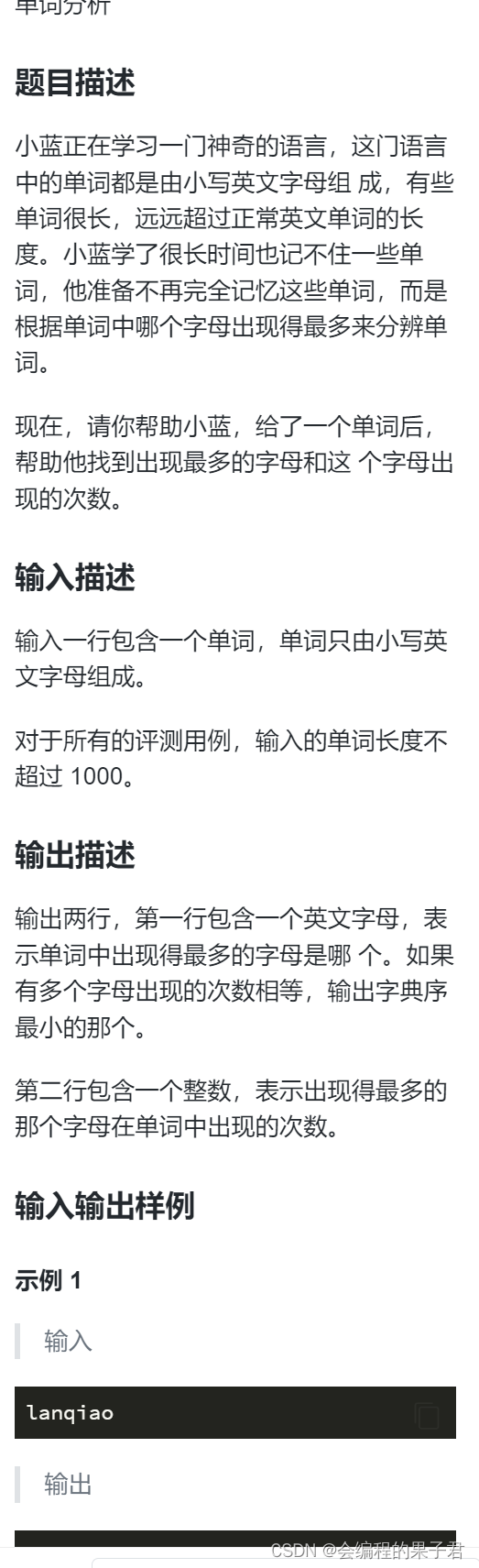 思路,通过getchar函数输入一个字母检测一个字母,一直到输入‘\n’,在下面当中如果出现重复字母,则count[ch-'a'] ++,这个是用来记录字母重复了多少次,最终帮助确定最大的字母重复的次数,以及重复最多的那个字母,下面的for循环用来遍历,查找重复最多的字母,最终打印出来
