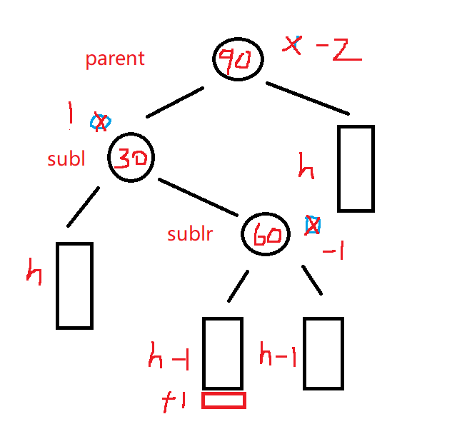 - 当subrl的平衡因子是-1时 左右双旋后parent subr subrl的平衡因子分别更新为 0 -1 0