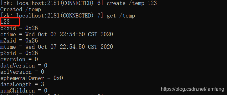 比如我们创建一个节点,create /zk "test"后,在linux下用get /zk后返回的信息如下: