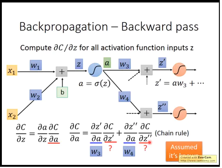 我们考虑一个神经元,假设就2个输入x1,x2,我们很容易就得出神经元的输出z,经过激活函数(sigmoid或Relu)输出传递给其他神经元。我们求C对w的偏导,根据链式法则,就得到2个偏微分的乘积,其中把