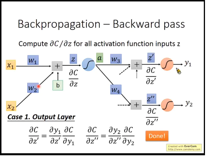 我们假设当前的神经元已经是最后一个,即输出就是准备送给计算损失函数的,那我们根据下图就可以求出C对Z',Z''的偏微分了,一个是激活函数对其的偏微分,另一个是根据你定义的损失函数模型的偏微分(可求)