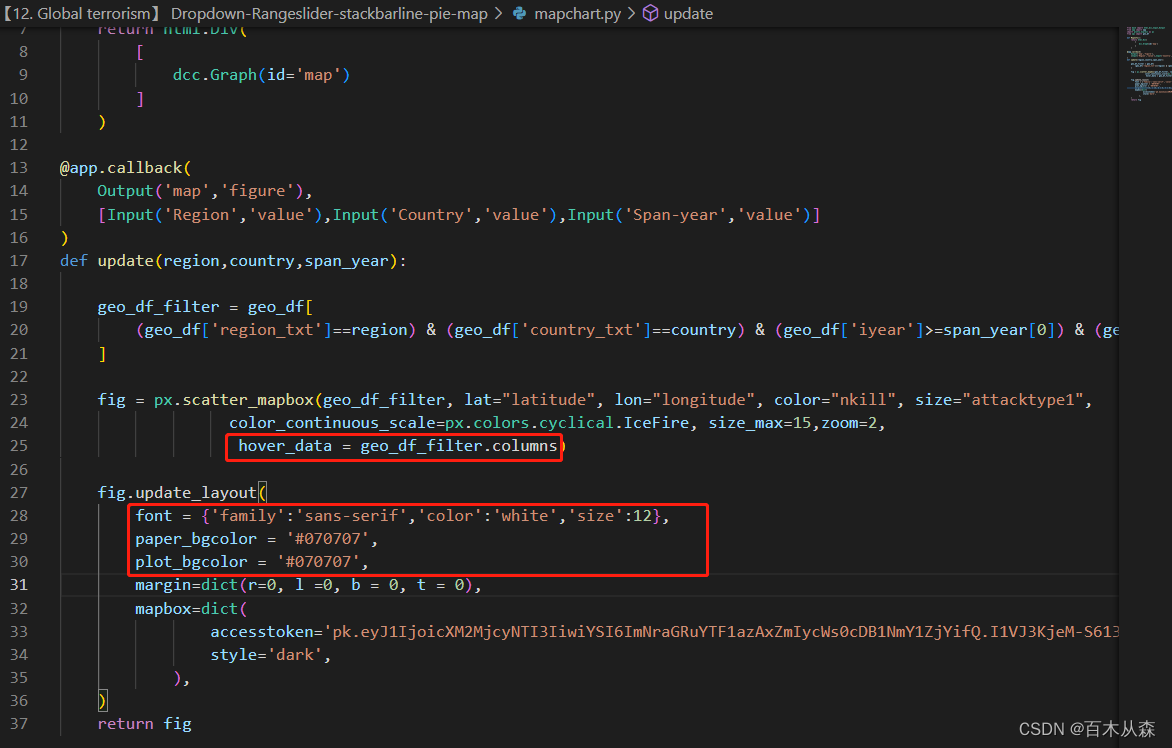 添加card_container属性(这个需要在index.py中),背景颜色,字体样色,然后丰富一些交互显示信息hover_data(需要是展示地理数据集中的字段名称),也可以使用go绘制图形后使用hovertext丰富交互信息,参照项目10。