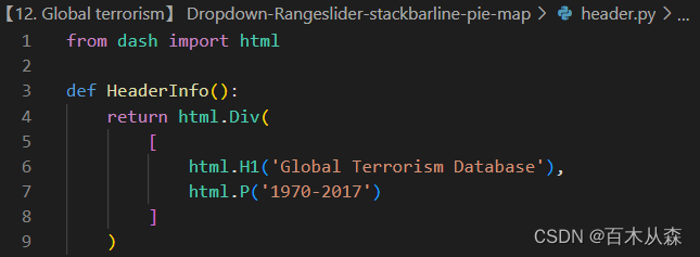 头部只有一个信息,使用HeaderInfo()填充内容,该函数分配在header.py文件中;而中间左侧是有三个筛选组件,直接用一个函数FilterInfo()填充内容,此函数分配在filteritem.py文件中,中间后两个图形分别用StackBarLineInfo()、PieInfo()两个函数填充,对应分配在stackbarline.py和piechart.py文件中; 下面只有一个图形展示,使用MapInfo()填充内容,该函数分配在mapchart.py文件中,该文件的全部代码如下。
