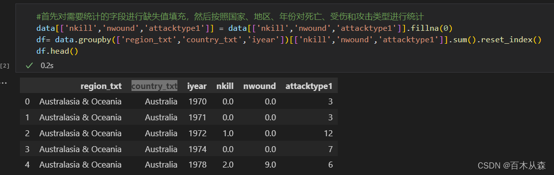 文件中的数据是每次恐怖主义发生的记录,因此一年中某一国家可能会发生多起恐怖主义事件,需要将数据进行分组汇总。汇总之前,留心观察数值字段存在着缺失值,因此需要先进行缺失值处理(这里缺失数据默认就是0),然后按照区域、国家和年份进行分组求和统计,代码及输出结果如下。