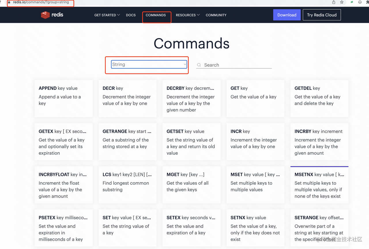 连接上 Redis 之后,我们再来看 Redis 里面关于字符串的命令。我们后续的介绍会尽可能覆盖官网的文档给的这些命令,如下图所示: