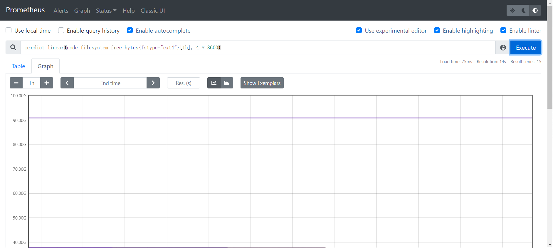 还可以直接使用 predict_linear() 对数据的变化趋势进行预测。例如,预测系统磁盘空间在 4 个小时之后的剩余情况:这个函数是用来做预测的,predict_linear() 这个函数对于磁盘空间来说的话是非常有用的,因为磁盘在实际使用的过程当中一下子就增长起来了,这是一个缓慢的过程,所以可以根据这个函数来判断4个小时之后磁盘剩余的情况,根据这个情况就可以提前去将磁盘空间清理或者扩容。