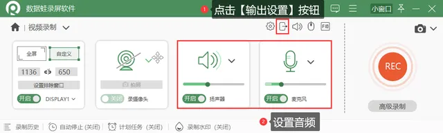 步骤3.点击主界面上的【视频录制】模式,进入视频录制页面,通过点击页面右上角的【输出设置】按钮,在视频设置处,您可以修改录屏文件的格式(默认格式为MP4),然后选择录制的范围点击【REC】按钮进行录制。