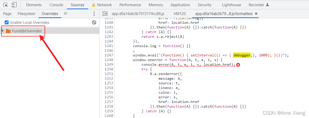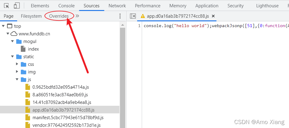 这时,在 Overrides 面板下就多了 FunddbOverrides 文件夹,用于存储所有我们想要更改的 JavaScript 文件,如下图所示: