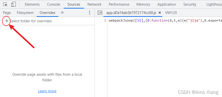 我们可以在 Overrides 面板上选定一个本地的文件夹,用于保存需要更改的 JavaScript 文件,下面来实际操作一下。切到 Overrides 面板,点击 + 按钮,如下图所示: