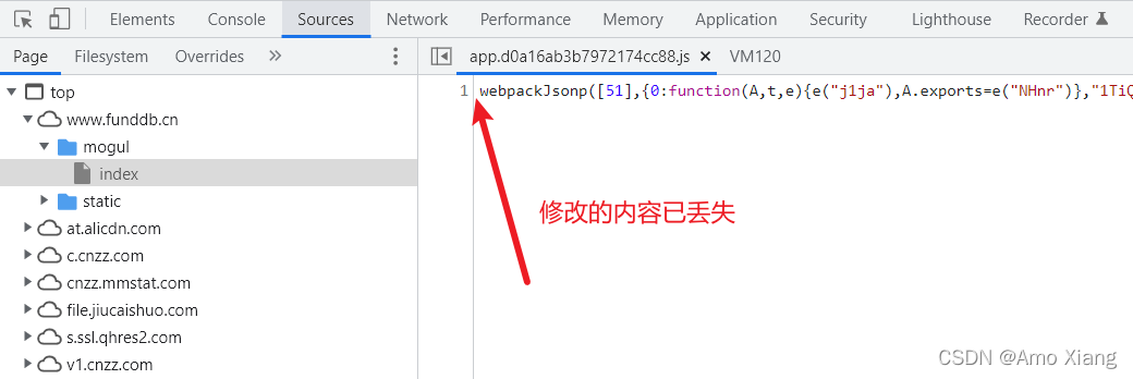 这时候我们可以发现 JavaScript 文件名左侧上出现了一个警告标志,提示我们做的更改是不会保存的。这时候重新刷新一下页面,再看一下更改的这个文件,如下图所示: