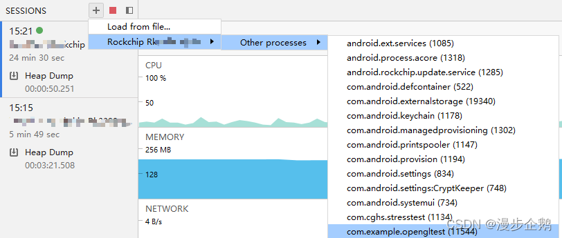 3、点击SESIONS "+"号按钮选择设备,选择对应设备下的应用或进程