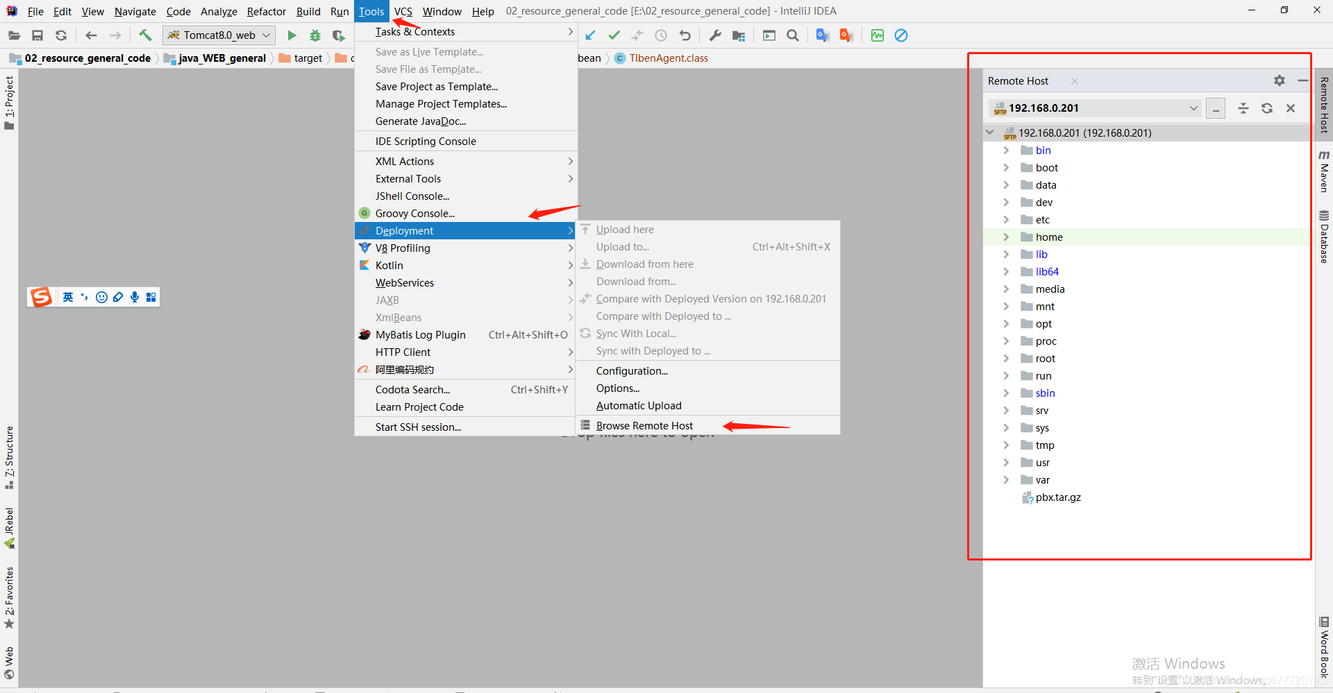 配置好之后Tools->Deployment->Configuration->Browse Romote Host查看服务器文件目录文件