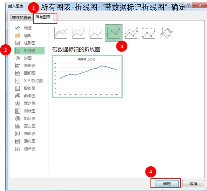Step 01选中汇总后的销售数据,点击上方的“插入”选项卡,单击“图表”浮动框的右下角。在打开的“插入图表”设置框中,点击“所有图表”-“折线图”,点击第四个示例图“带数据标记折线图”-确定。