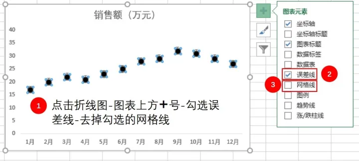 Step 05点击折线标记,单击折线图右上角的十字,勾选“误差线”,去掉勾选“网格线”。