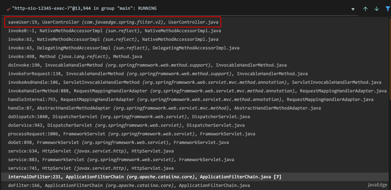 当pos < n,说明已执行完所有过滤器,才调用 servlet.service(request, response) 执行真正业务。从 internalDoFilter() 执行到 Controller#saveUser() 。