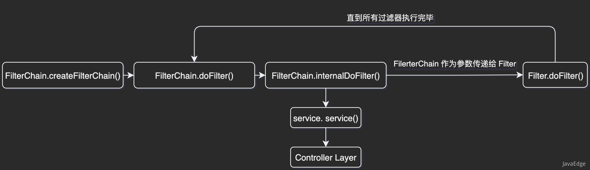 管理特定请求的一组过滤器的执行。 当所有定义的过滤器都执行完毕后,对 doFilter() 的下一次调用将执行 servlet#service() 本身。