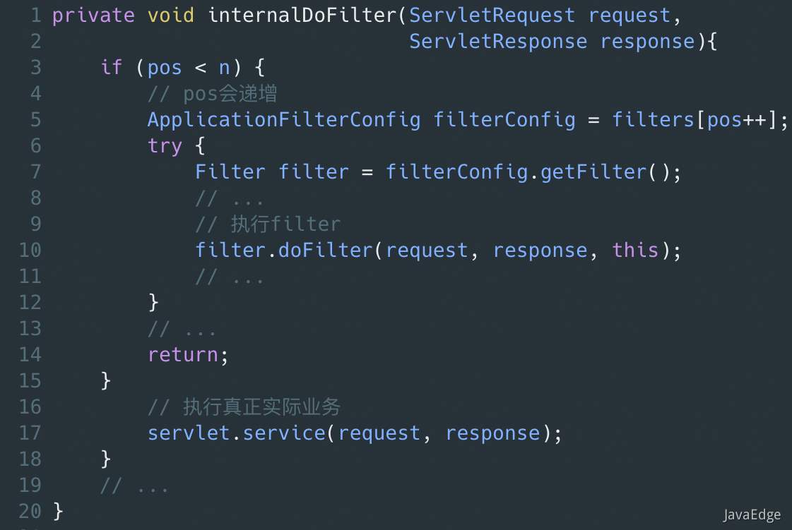 每被调用一次,pos 变量值自增 1,即从类成员变量 Filters 中取下一个 Filter: