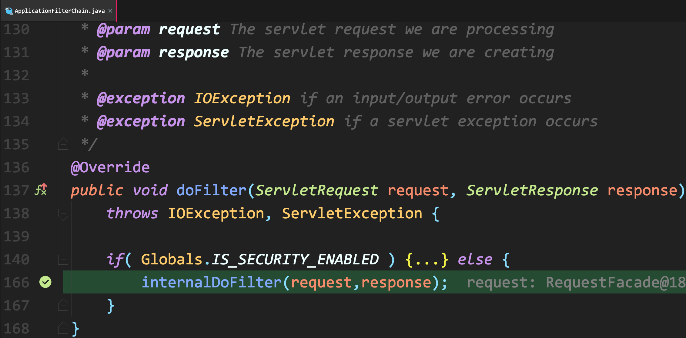 FilterChain chain) throws IOException, ServletException - 在 Filter 类的 doFilter() 中,执行Filter定义的动作并继续传递,获取第三个参数 ApplicationFilterChain,并执行其 doFilter()