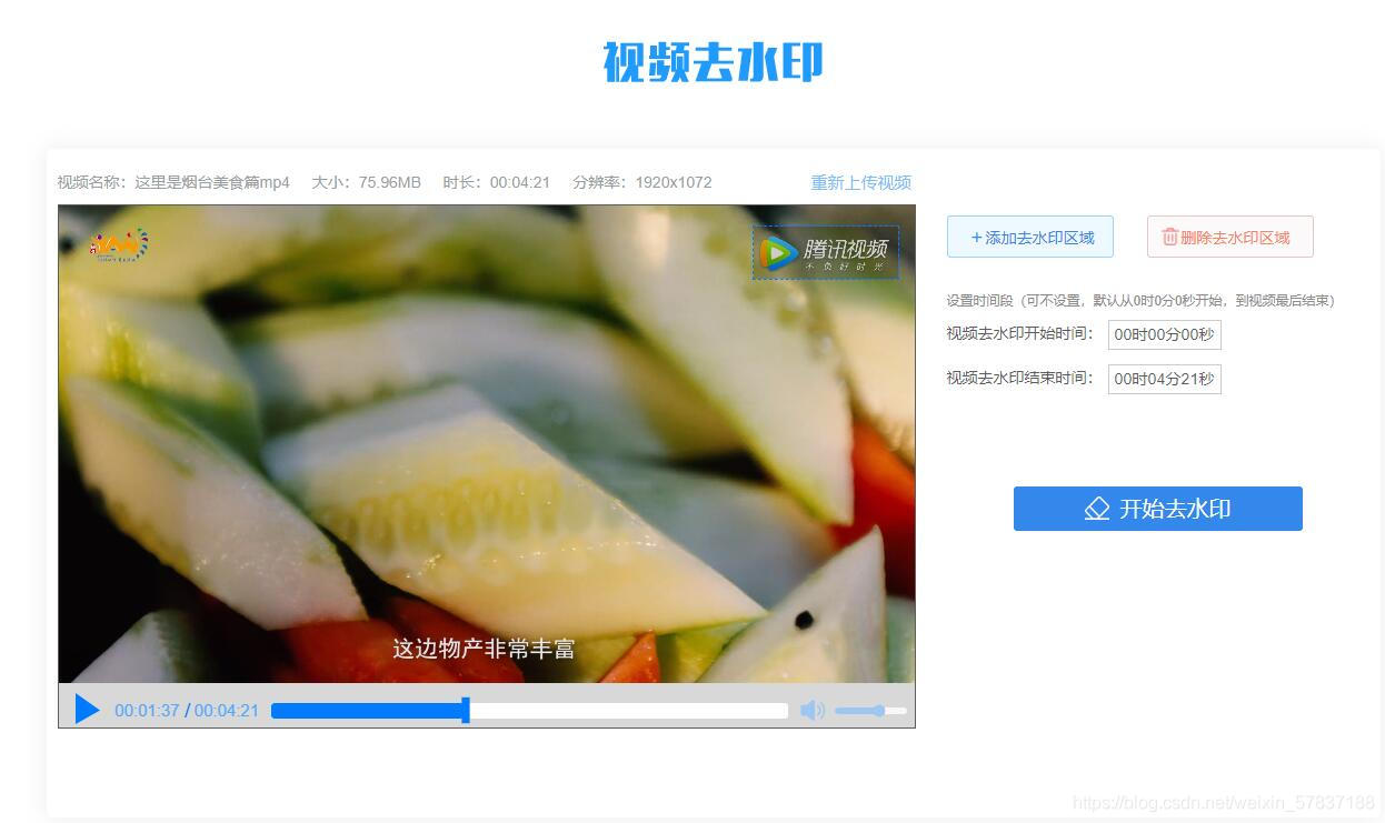 视频文件上传完毕后添加去水印区域,然后会在视频上会出现一个水印框,然后调整水印框大小和水印框的位置,把水印框的大小和位置调整到和水印的位置相符即可,然后点去水印按钮,这时候就开始去水印了,去水印的时间也是根据视频大小,这个时候耐心等待下。