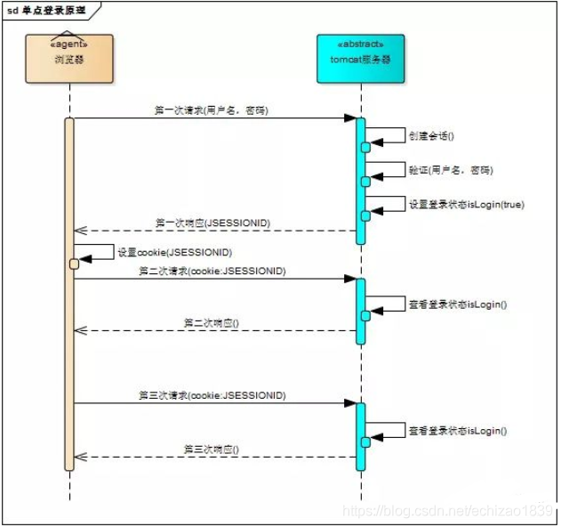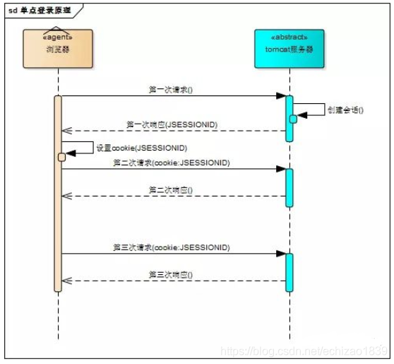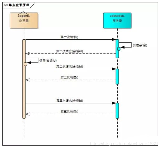 浏览器第一次请求服务器,服务器创建一个会话,并将会话的id作为响应的一部分发送给浏览器,浏览器存储会话id,并在后续第二次和第三次请求中带上会话id,服务器取得请求中的会话id就知道是不是同一个用户了,这个过程用下图说明,后续请求与第一次请求产生了关联。