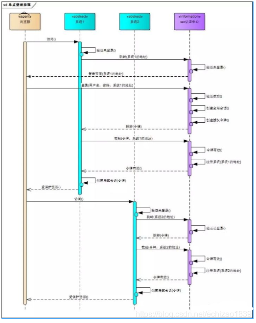 相比于单系统登录,sso需要一个独立的认证中心,只有认证中心能接受用户的用户名密码等安全信息,其他系统不提供登录入口,只接受认证中心的间接授权。间接授权通过令牌实现,sso认证中心验证用户的用户名密码没问题,创建授权令牌,在接下来的跳转过程中,授权令牌作为参数发送给各个子系统,子系统拿到令牌,即得到了授权,可以借此创建局部会话,局部会话登录方式与单系统的登录方式相同。这个过程,也就是单点登录的原理,用下图说明