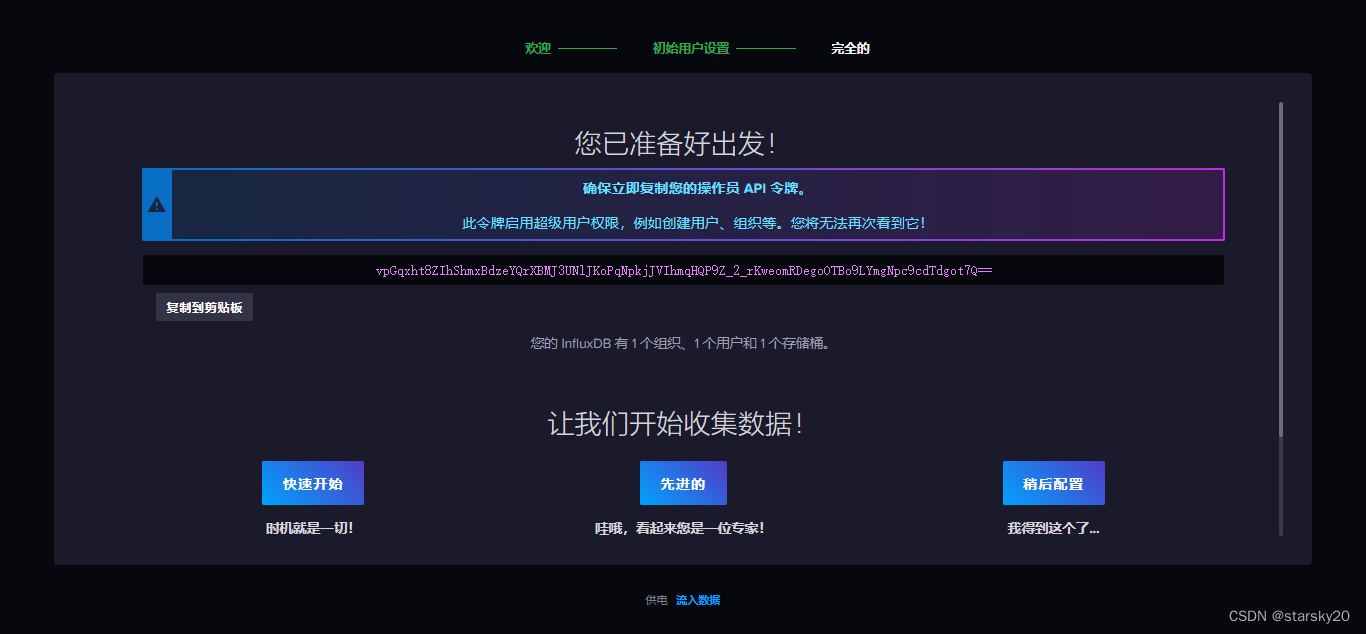 Error: failed to write data: 401 Unauthorized: unauthorized access,即写入数据失败:401未经授权:未经授权的访问,需要创建token令牌。