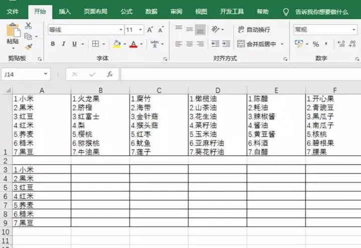 最近就遇到下面的问题,每个单元格里有7种产品。现在要求把下表中A1单元格的数值分别拆分到A3、A4、A5……各个单元中去,B1、C1、D1、E1、F1也要实现同样拆分。