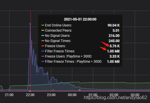 从监控图中可以看到,3.76k的用户,两分钟内报卡顿次数达到100万次 ,很恐怖,这个是非正常的卡顿