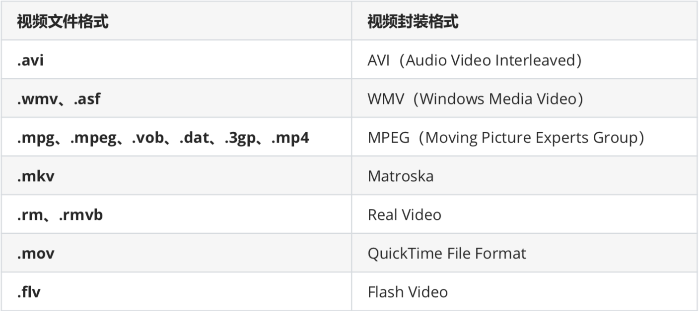 常见的几种视频封装格式和文件格式之间的对应关系如下表所示: