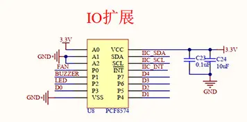 在这个芯片的引脚中,VCC和GND为电源和地引脚,A0~A2为从器件地址,通过引脚的输入电平,可以配置地址为0~7,因此一个IIC总线上最多可以挂载8片PCF8574芯片。SDA和SCL为IIC总线的数据和时钟接口。INT为中断反馈接口。P0~P7为扩展的并口,可以用作输入或者输出