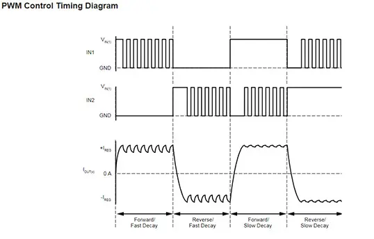 我们使用两块A4950芯片实现对两路轮胎控制电机的驱动;A4950的功能与TB6612FNG类似,不同点在于:TB6612FNG有2路Pin控制电机正反转,1路PWM输入信号(也就是说一个电机需要三个引脚控制)。而A4950使用两路输入的信号差分进行正反转和速度的控制,如下图: