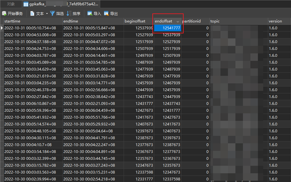 问题解决: 找到对应的入库表gpkafka_保存的偏移量,我们可以看到结束endoffset是12541777,而读取的kafka的最小偏移量已经是13396513了😄
