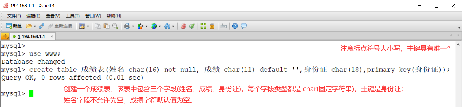 mysql> create table 成绩表(姓名 char(16) not null, 成绩 char(11) default ‘’,身份证 char(18),primary key(身份证));
