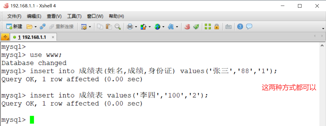 mysql> insert into 成绩表(姓名,成绩) values(‘zhangsan’,‘88’);