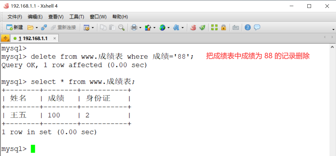 mysql> delete from www.成绩表 where 成绩=‘88’;