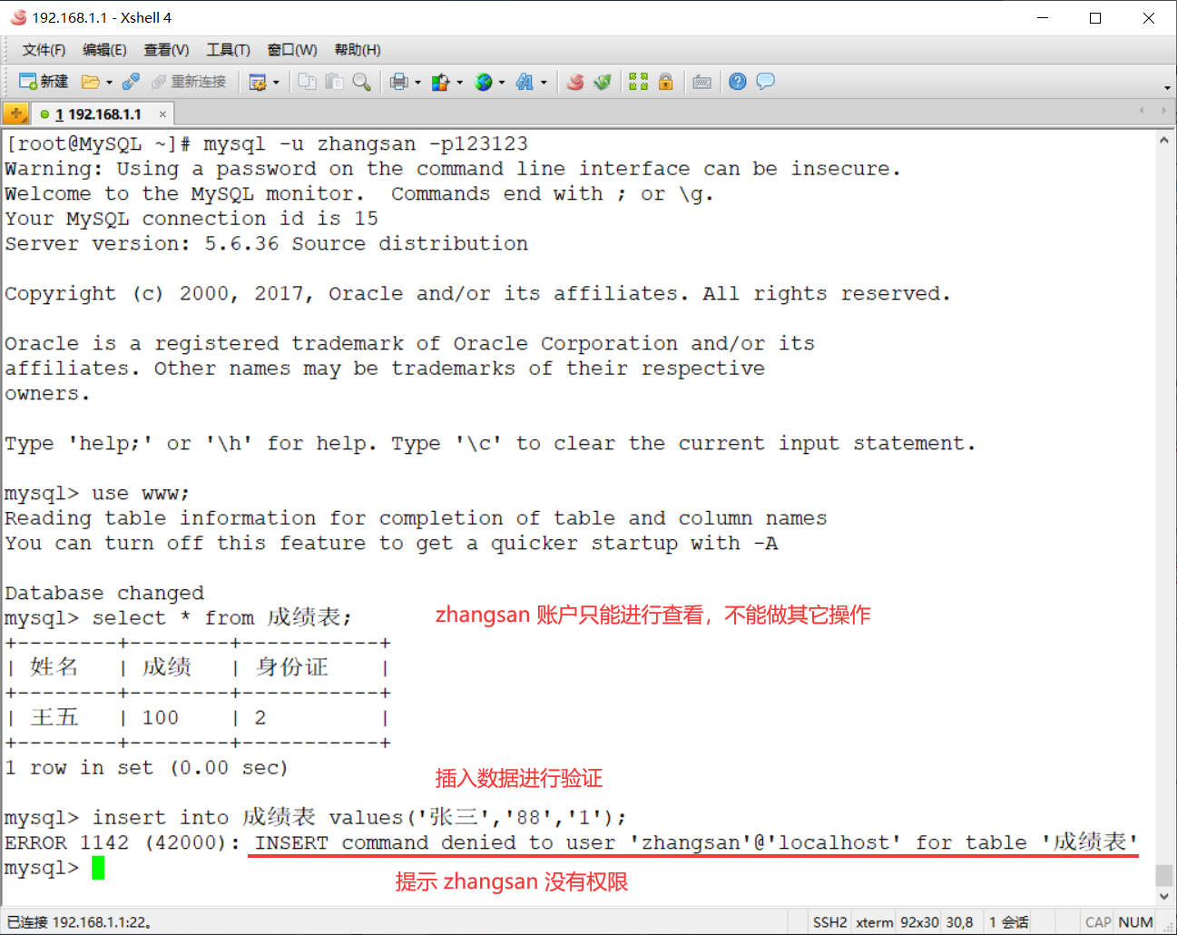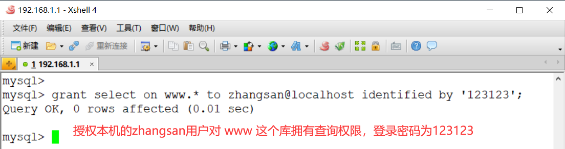 mysql> revoke select on www.* from zhangsan@localhost;