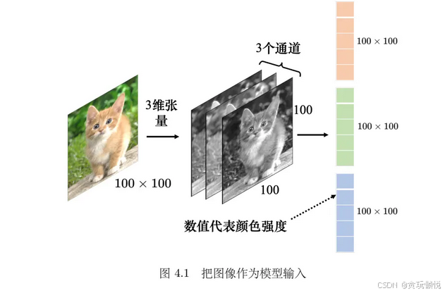 将代表图像的三维张量输入到网络里之前,需要先将它“拉平”,对于一张尺寸为100*100像素的图像,张量有 100 × 100 × 3 个数字,所以一张图像是由100×100×3 个数字所组成的,每个数值是某一个像素在某一个通道下的颜色强度。把这些数字排成一排就是一个巨大的向量。这个很长的向量就是特征向量,我们是把它丢给模型去处理。(在输入之前记得要把所有图像都调成一样的尺寸)。