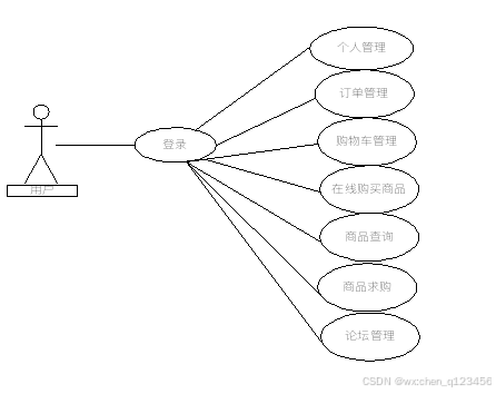 用户可以管理个人资料、查询商品、在线购买和加入购物车、管理订单、发布求购等,用户的个人资料是由用户注册时产生,用户的订单内容由用户在购买商品时产生,用户购物车内容由用户在加入购物车操作时产生。用户用例图如下图2-2所示: