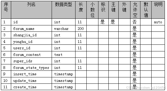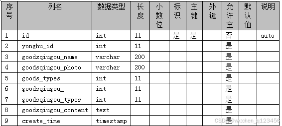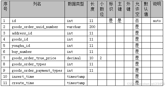 数据库表是把ER图进行详细化、实体化。不同的表名下保存着相对应的表信息数据。在数据库表里记录着数据的主键、外键、数据类型、长度等。本校园二手交易平台所创建的数据库表有用户信息表、商品信息表、订单信息表、管理员信息表等。本校园二手交易平台的数据库表如下表3-1—3-15所示: