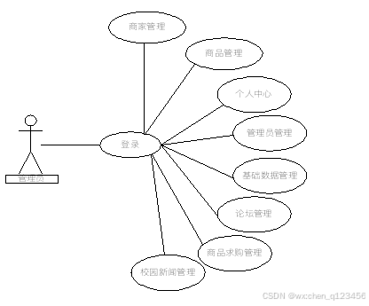 系统的功能分析决定了系统的功能设计,完整详细的系统功能分析可以使系统的开发事半功倍。本系统的功能围绕用户、管理员、商家三种权限设计。根据不同权限的不同需求设计出更符合用户要求的功能。本系统中管理员主要负责审核管理用户,审核商家发的商品,发布新闻等,用户可以对需要的商品进行购买、加入购物车等。商家负责商品的发布和订单的处理。本校园二手交易平台管理员的用例图如下图2-1所示: